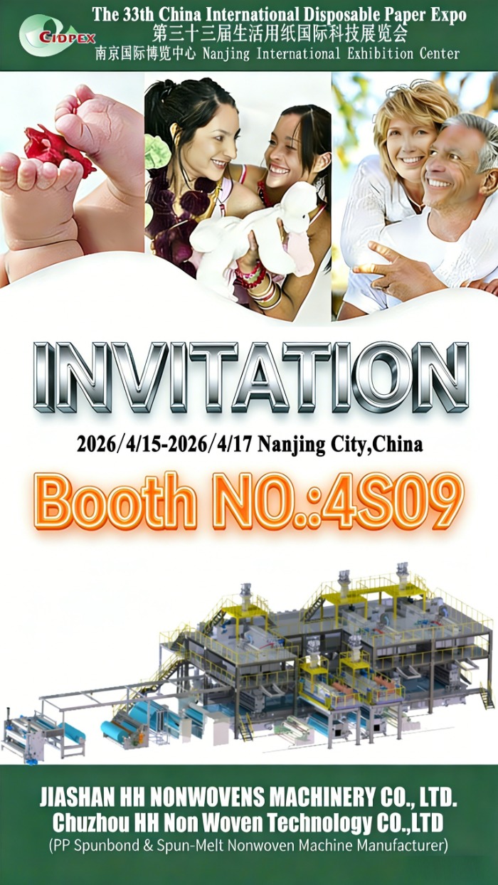 JIASHAN HH Nonwovens Machinery CO., LTD. og Chuzhou HH Non Woven Technology CO., LTD er stolte av å kunngjøre vår deltakelse i 33. China International Disposable Paper Expo (CIDPEX 2026) , finner sted fra 15. til 17. april 2026 , på Nanjing International Exhibition Center, Nanjing City, Kina.