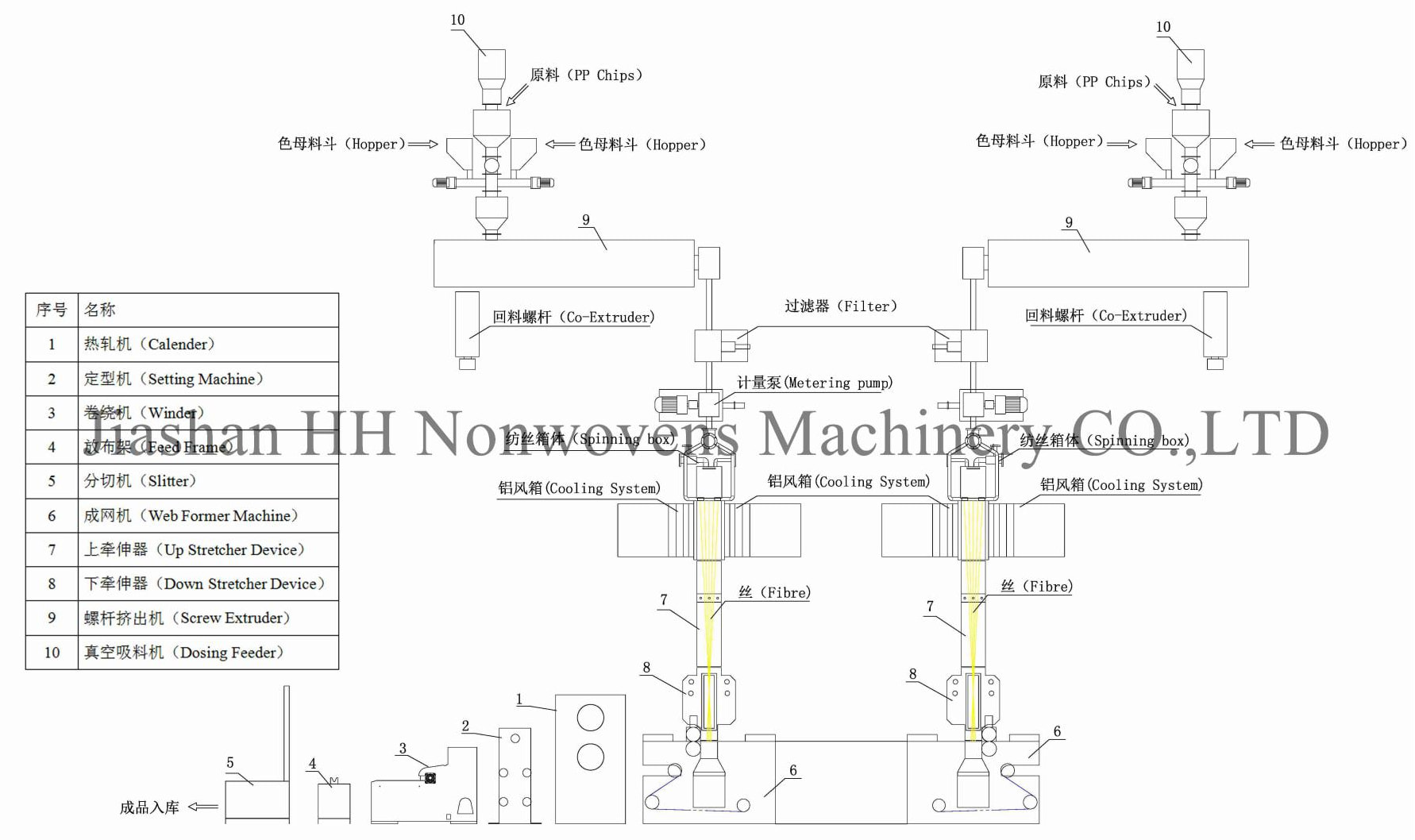 Bruk CNC for å produsere hoveddeler av pp spunbond nonwoven maskinen. Maskinrulle bruker dynamisk balansemaskin for å produsere rullene slik at maskinen kjører i høy hastighet. Hovedmotorer bruker Siemens-motor, og bruker Siemens eller ABB-driver for å kontrollere hele maskinen .